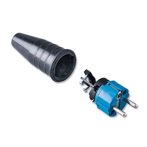 De Keraf 521 is een schuko stekker met blauwe codering voor intensief gebruik met vernikkelde contacten en hoge drukbestendigheid